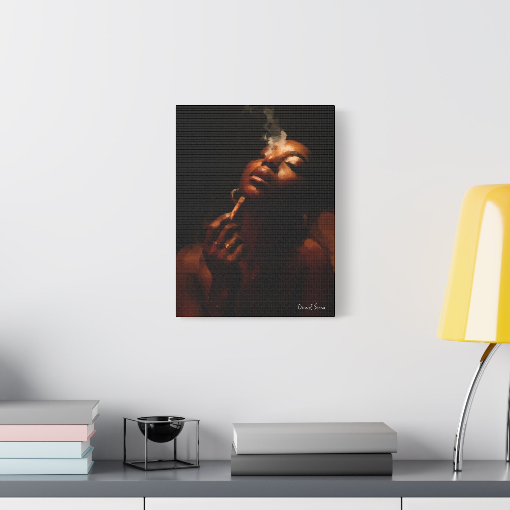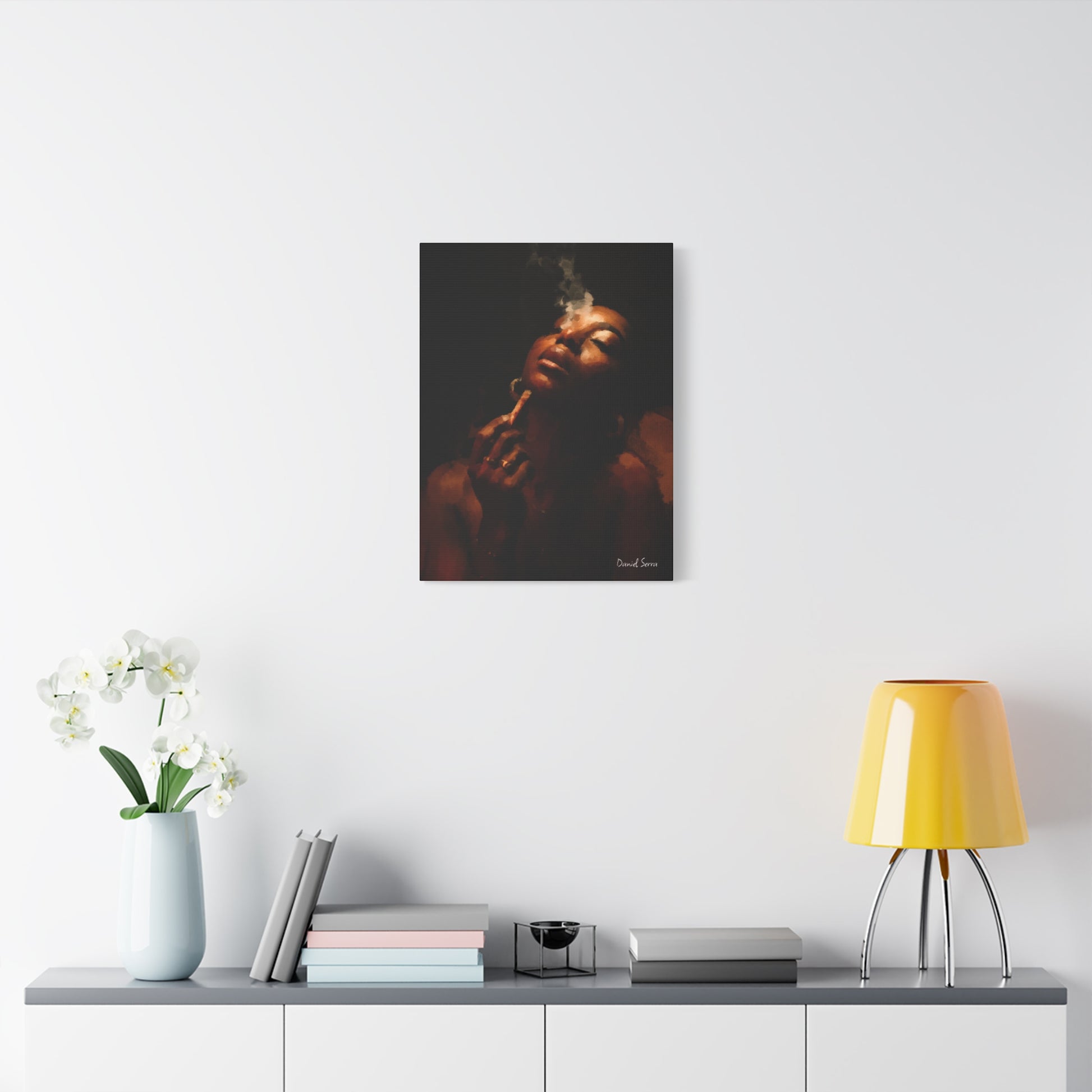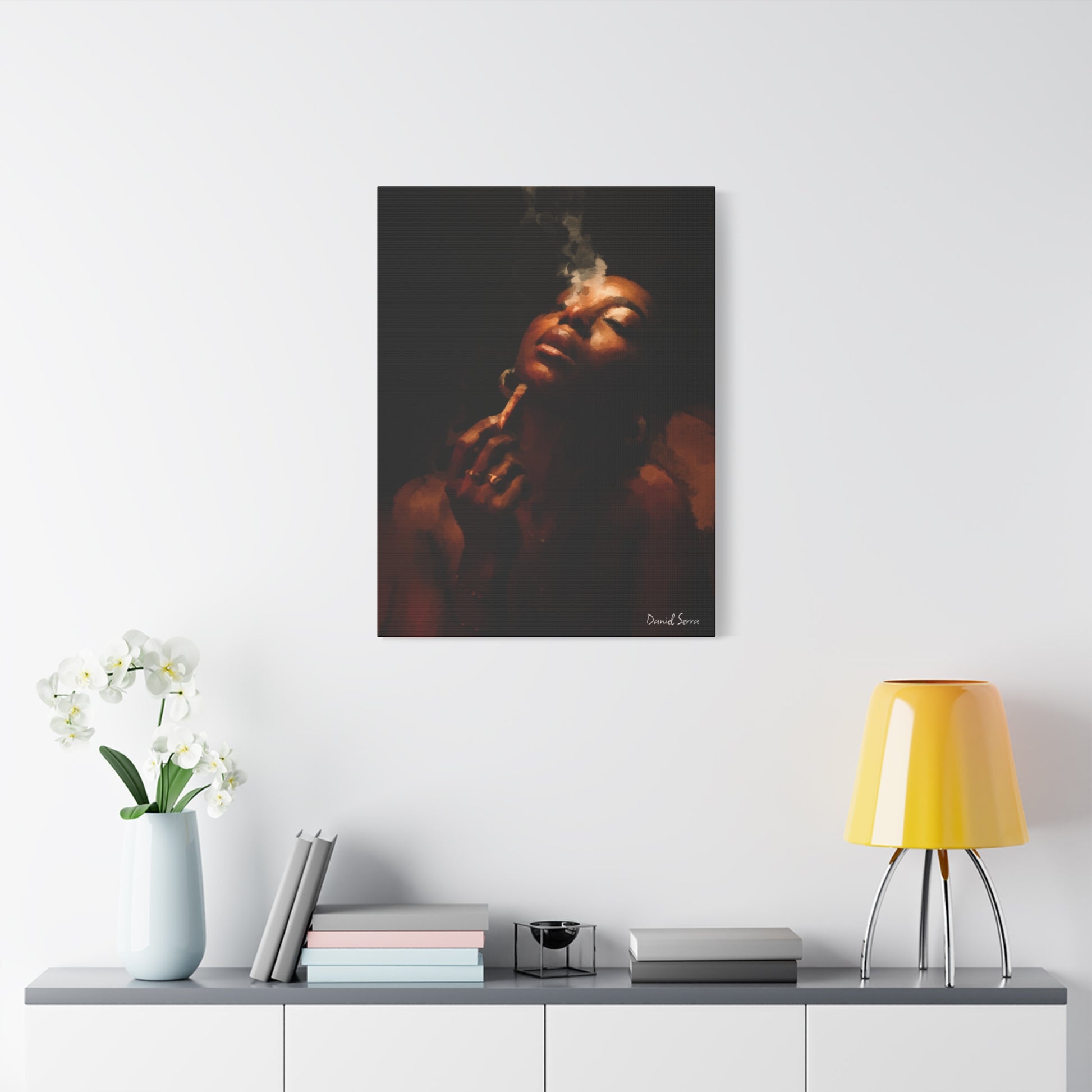 Bathed in warm shadows, a woman exhales smoke that rises like whispers of forgotten dreams. This artwork captures sensuality, introspection, and the fleeting beauty of a single moment suspended in time.