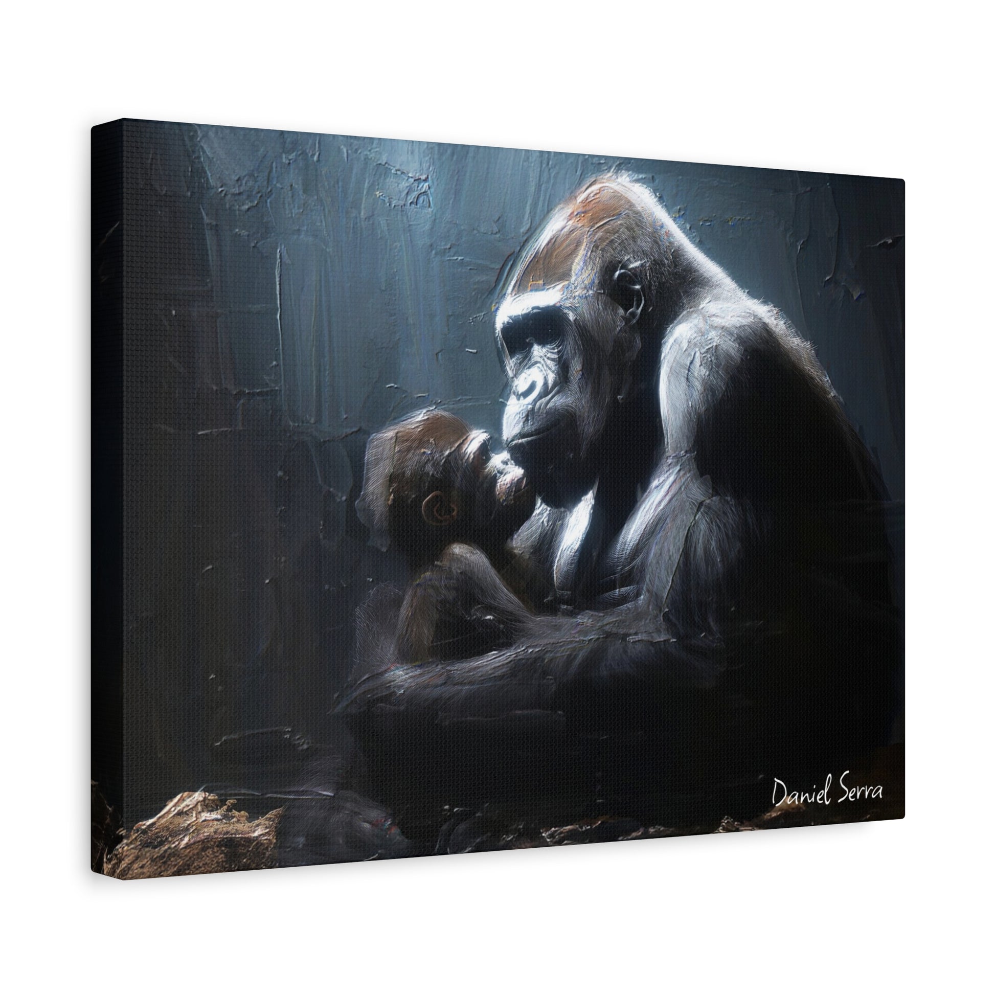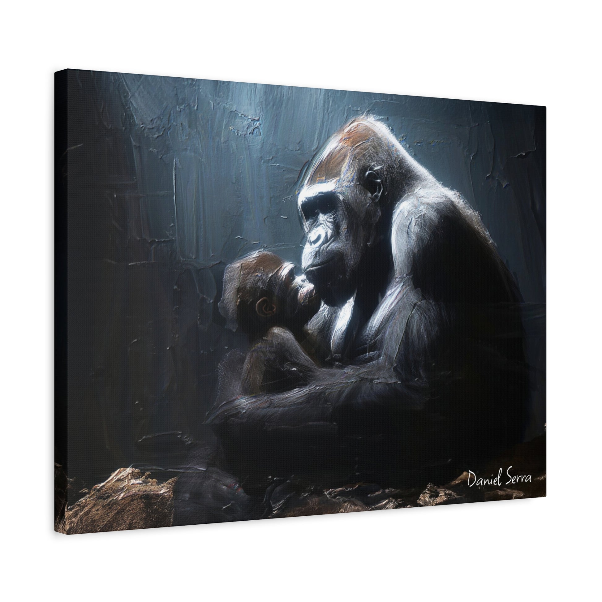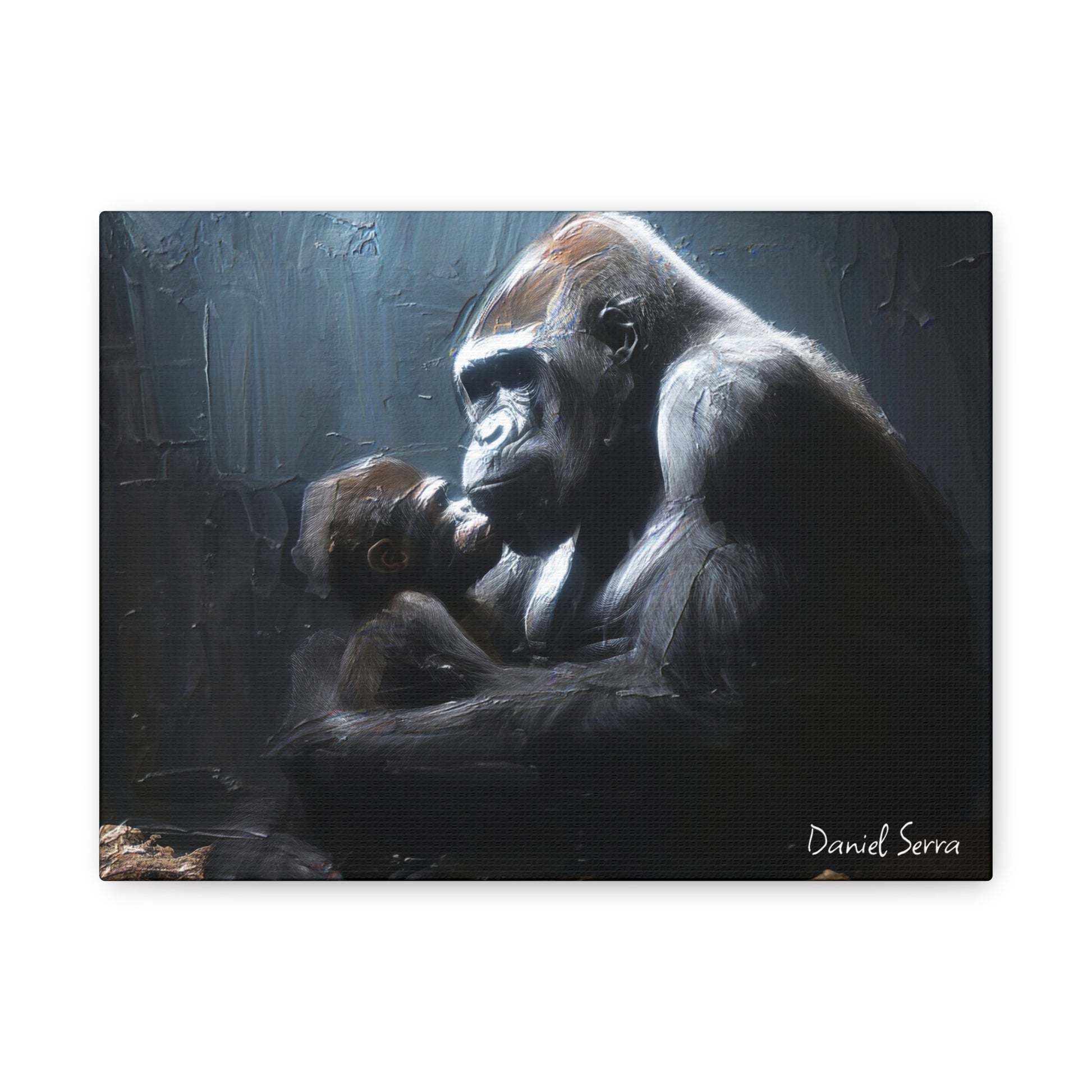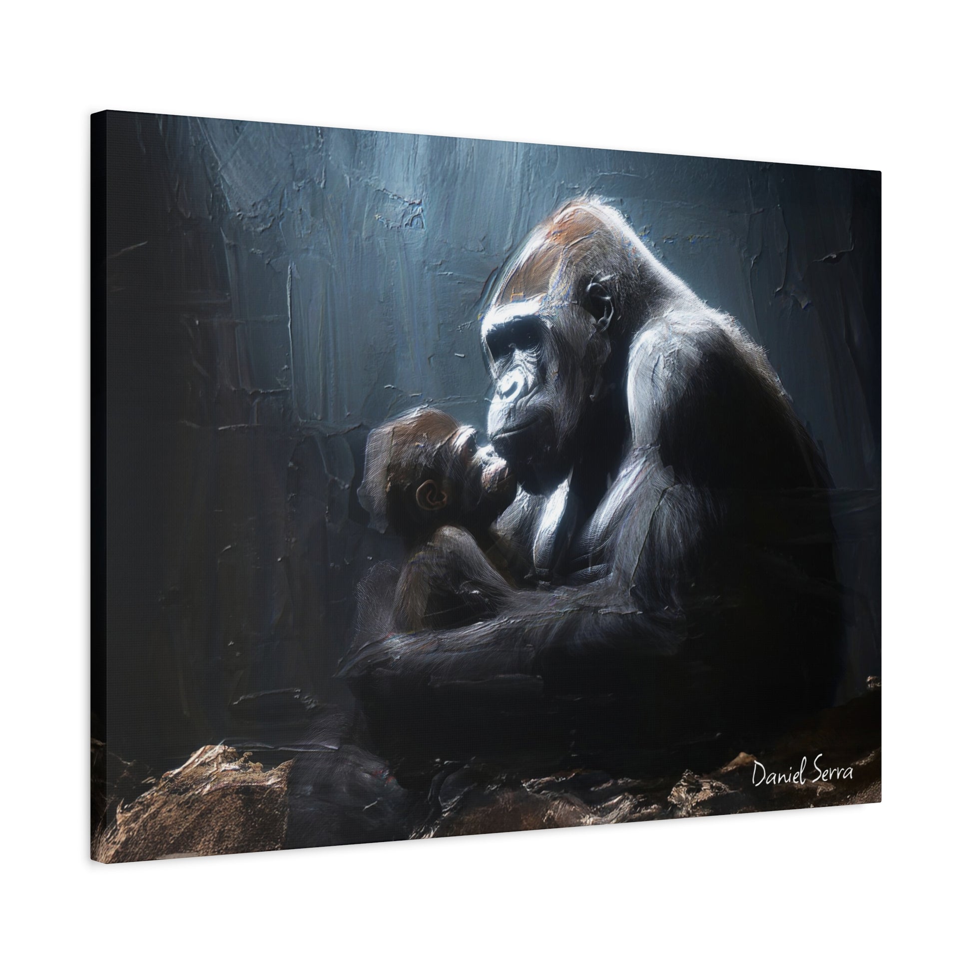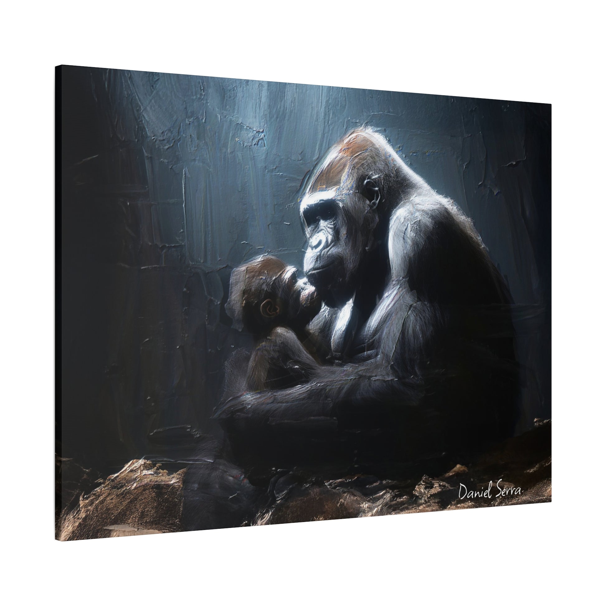 In the quiet shadows, a gorilla cradles her baby with tenderness and unyielding strength. This artwork captures the raw beauty of motherhood — protection, love, and the silent promise of a bond that lasts forever.