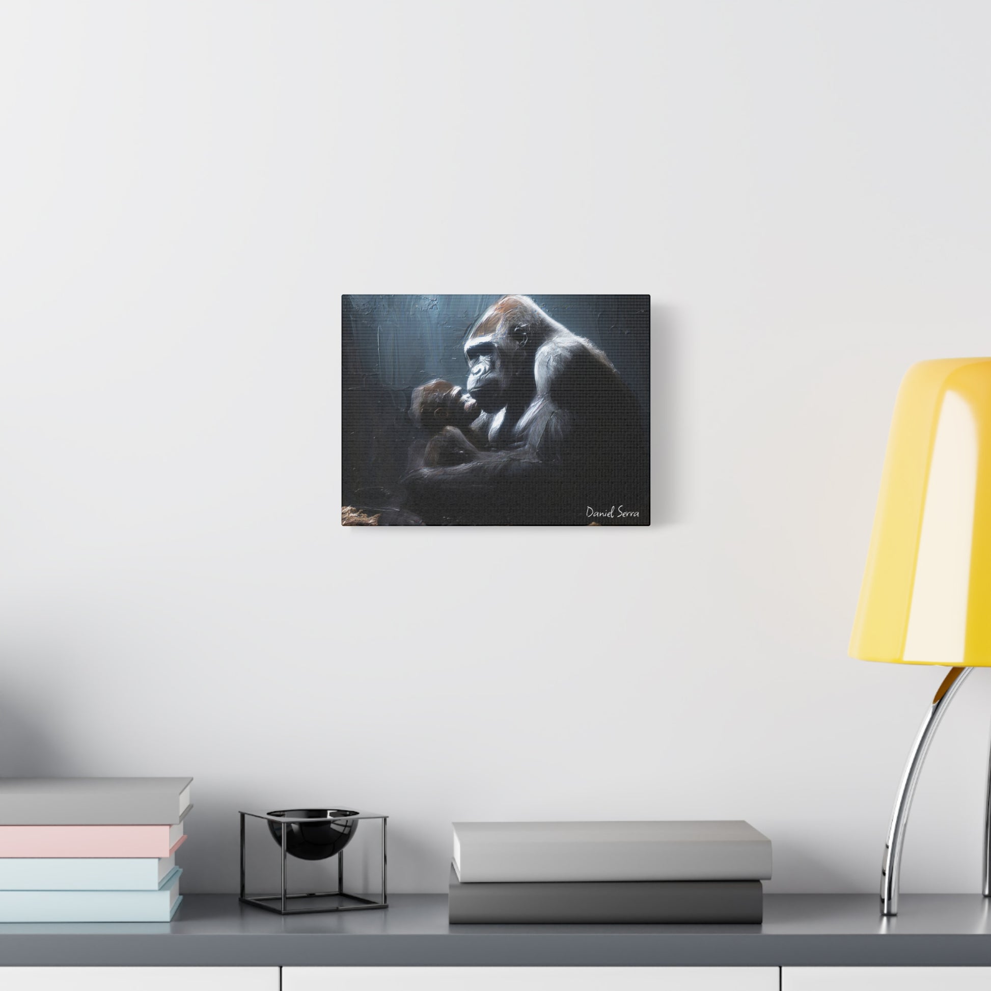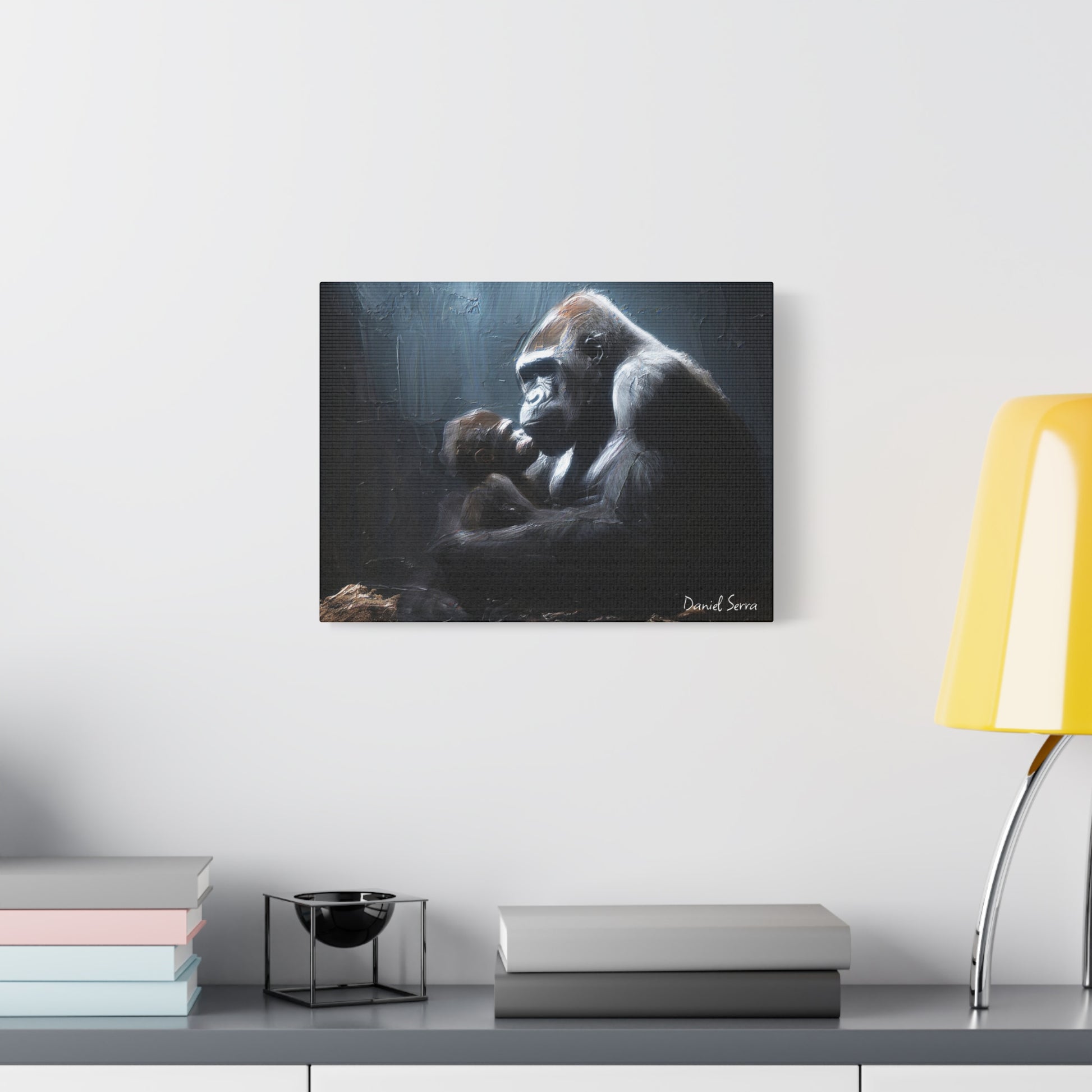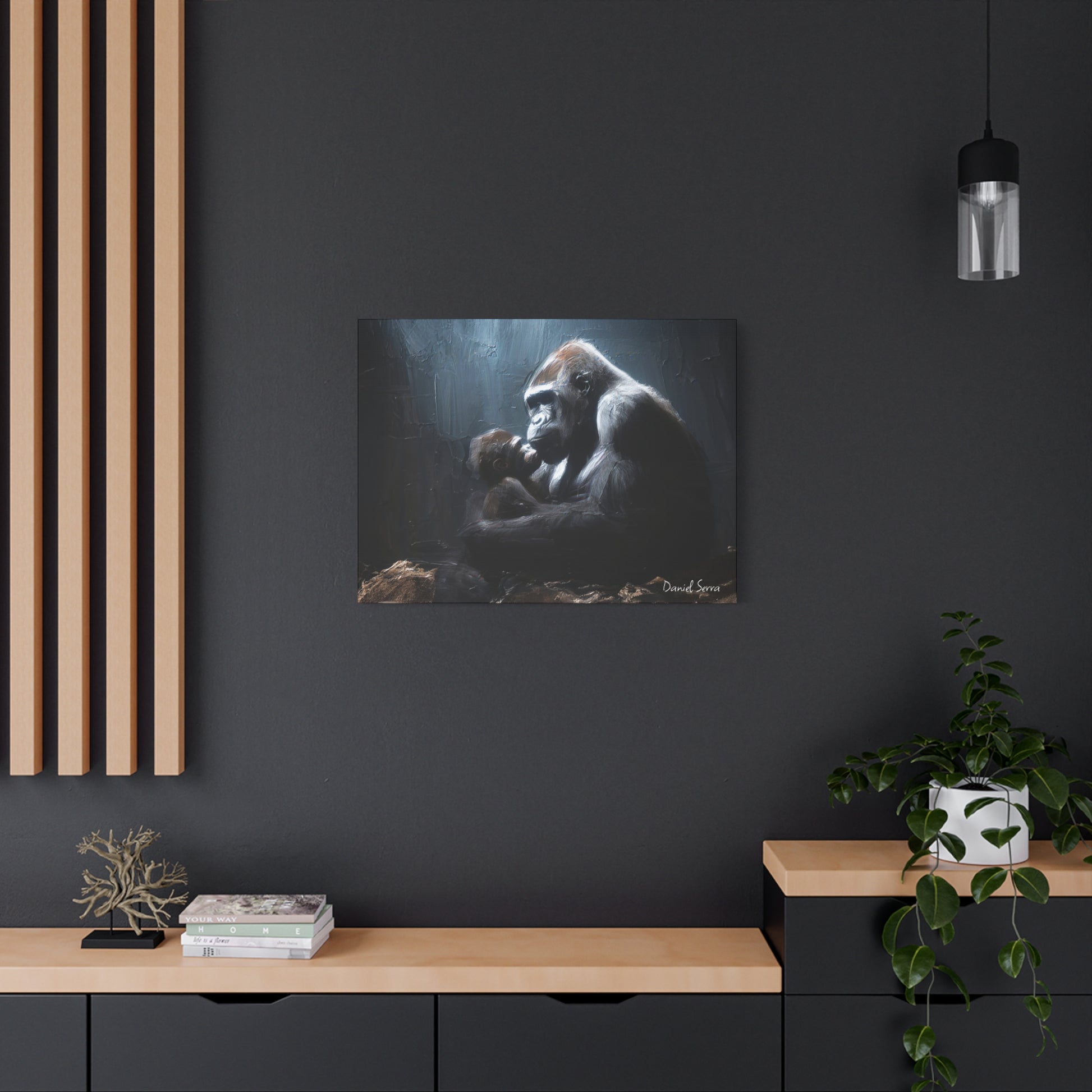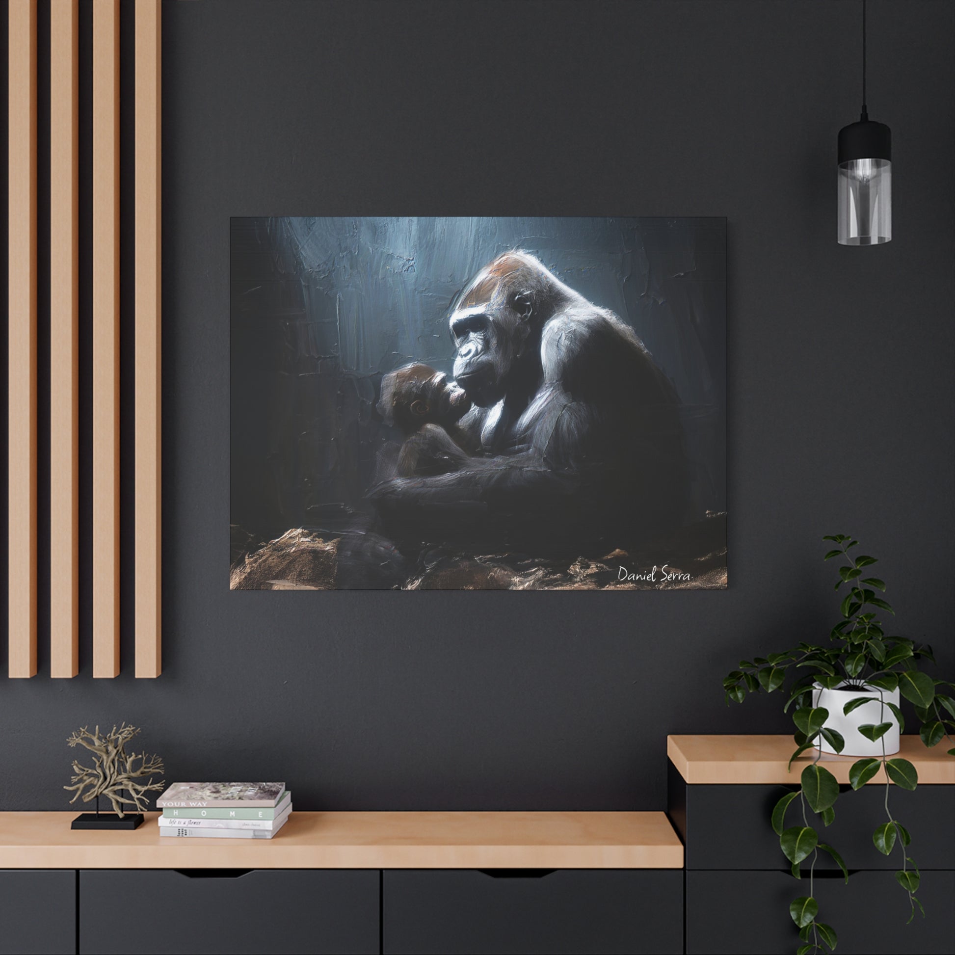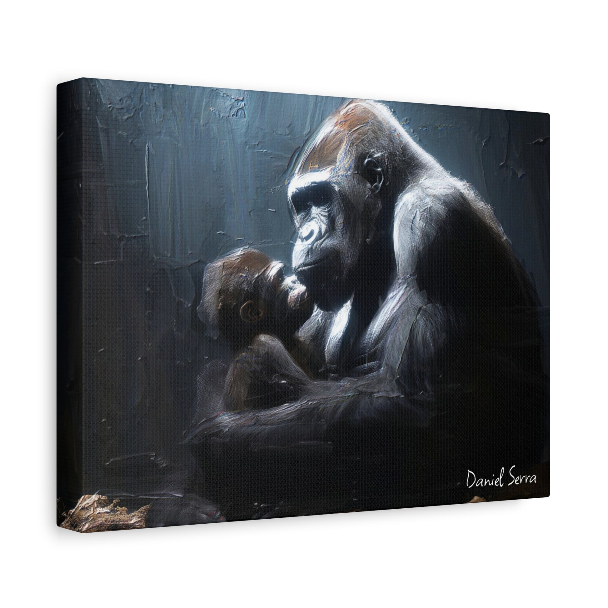In the quiet shadows, a gorilla cradles her baby with tenderness and unyielding strength. This artwork captures the raw beauty of motherhood — protection, love, and the silent promise of a bond that lasts forever.