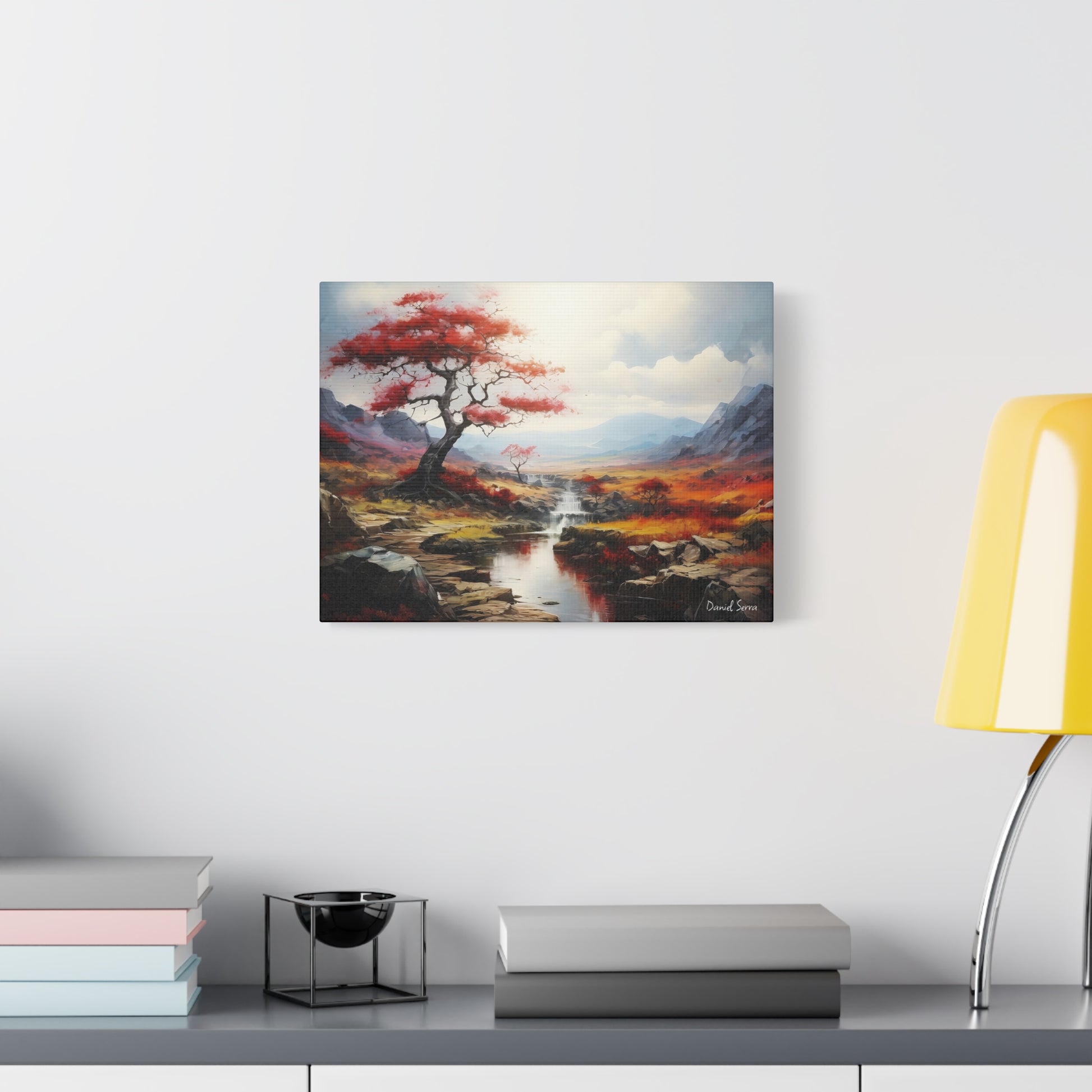 A crimson tree stands tall by a winding river, its reflection flowing through a valley painted in autumn’s vibrant hues. This artwork captures serenity, harmony, and the timeless beauty of nature’s changing seasons.