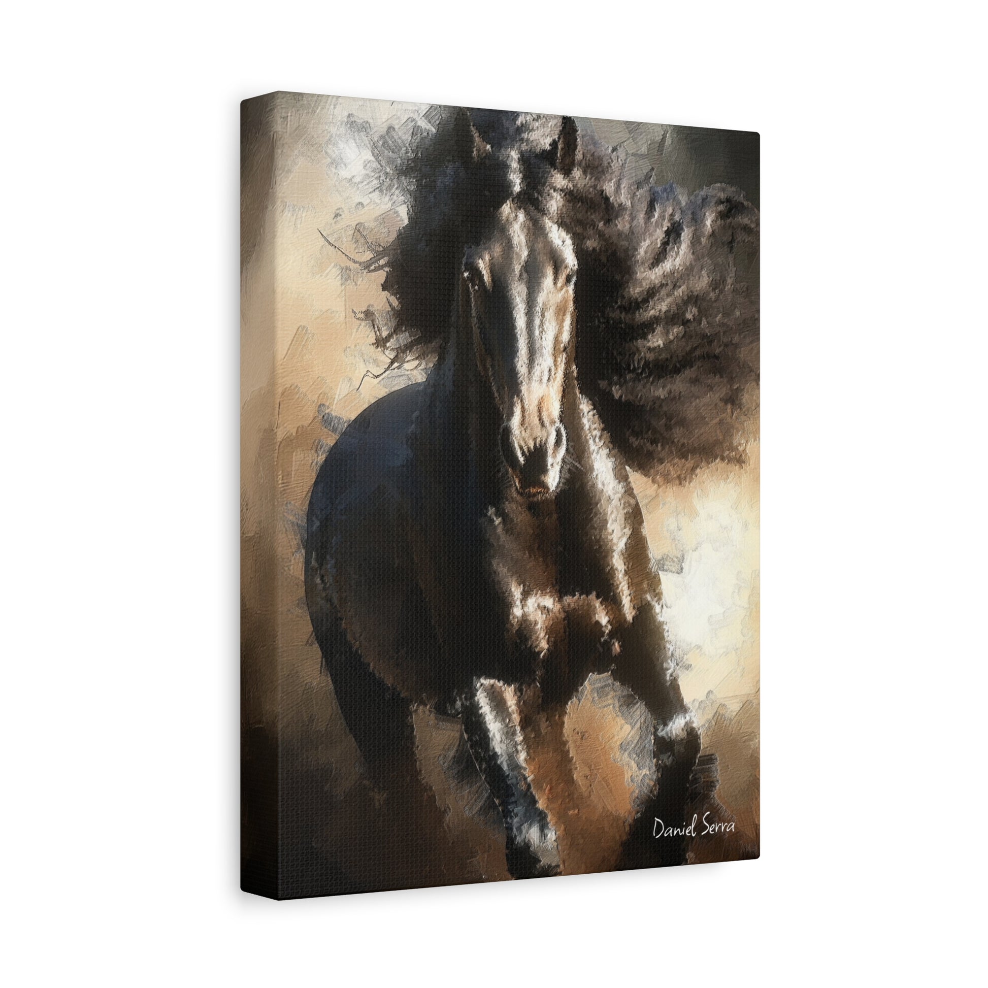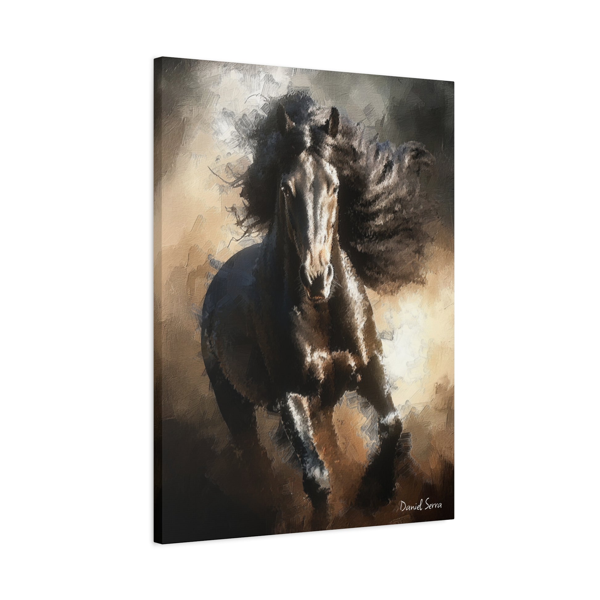 A majestic black horse charges forward through light and shadow, embodying strength, elegance, and the untamed spirit of pure freedom.