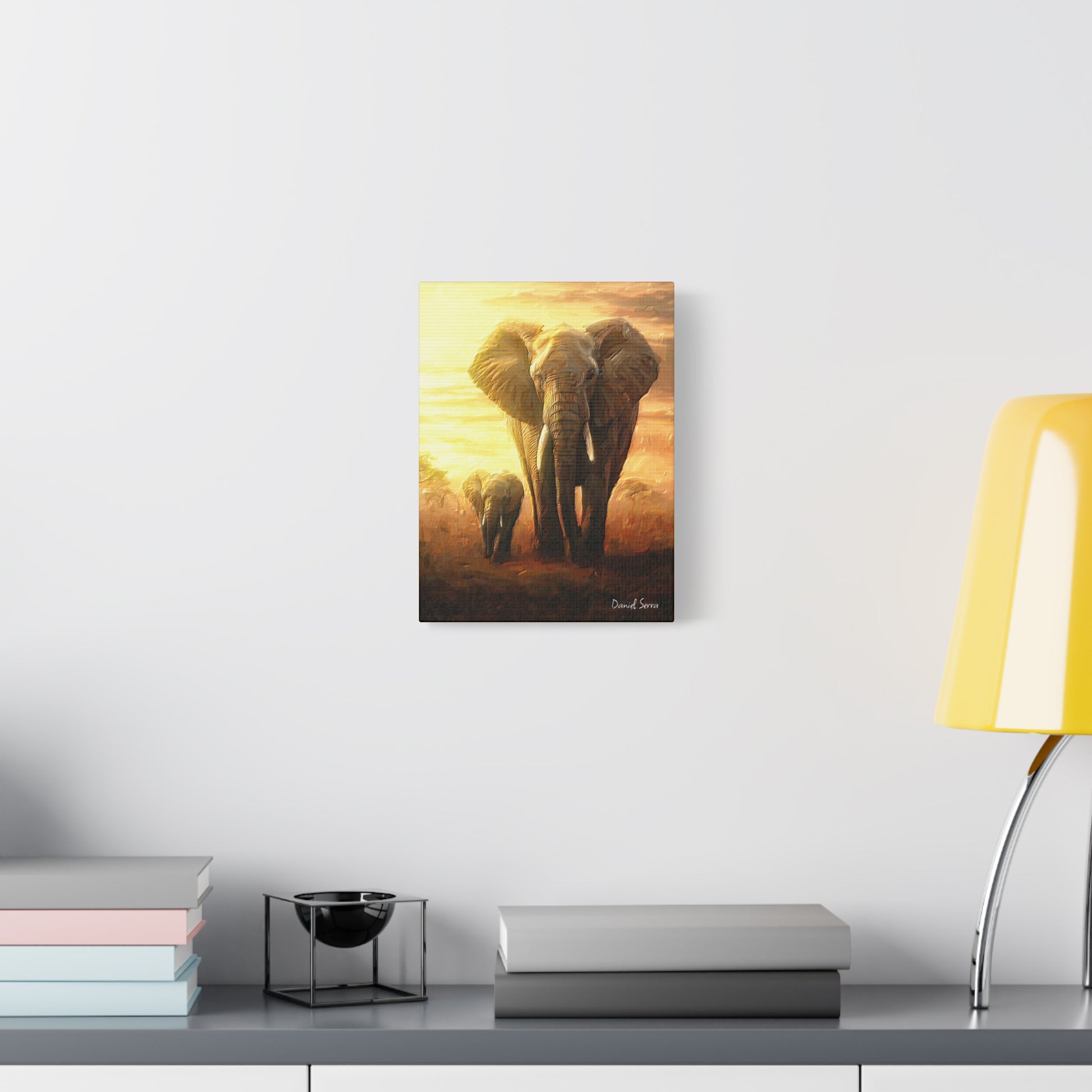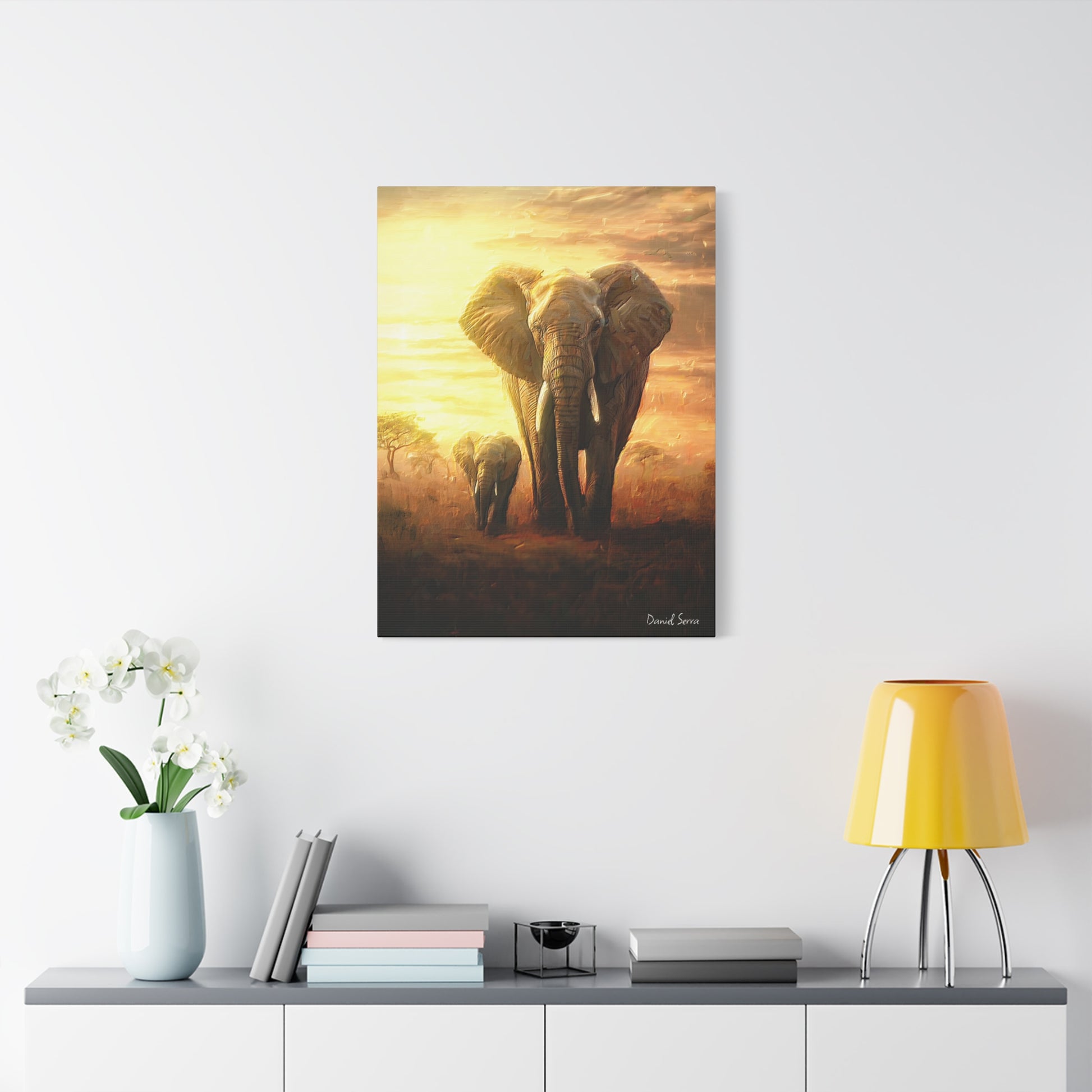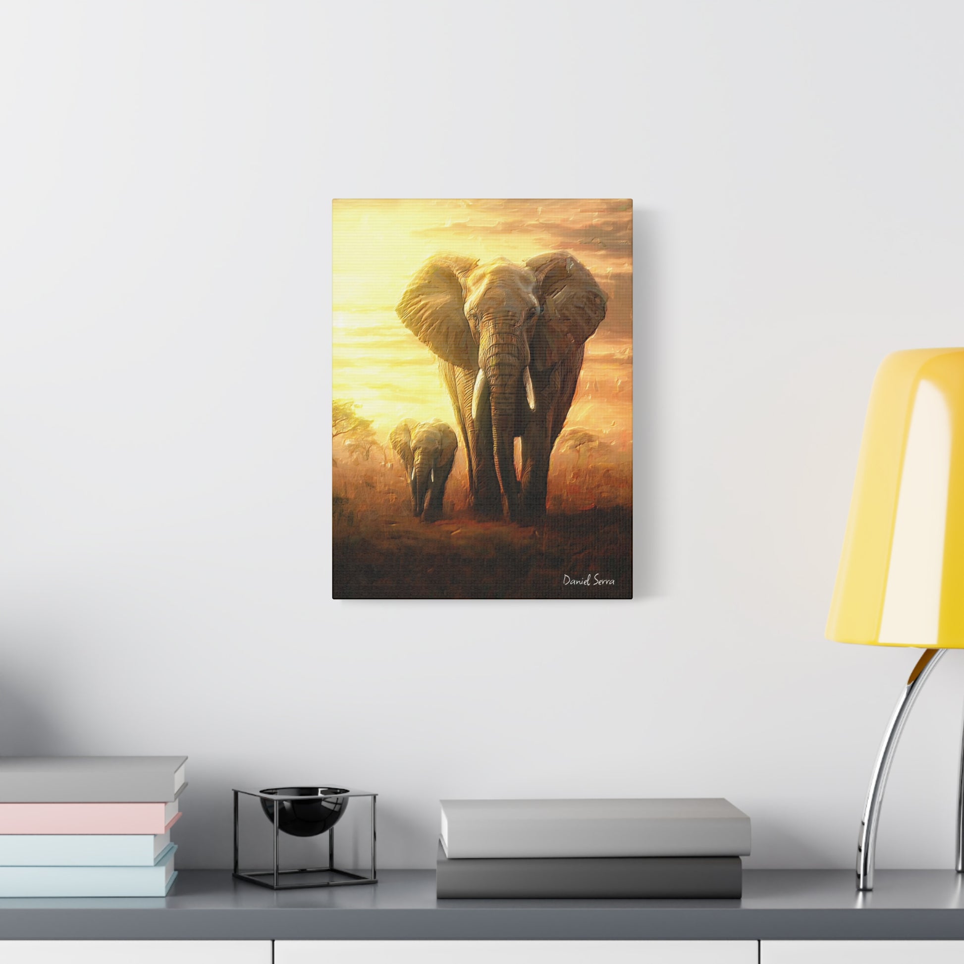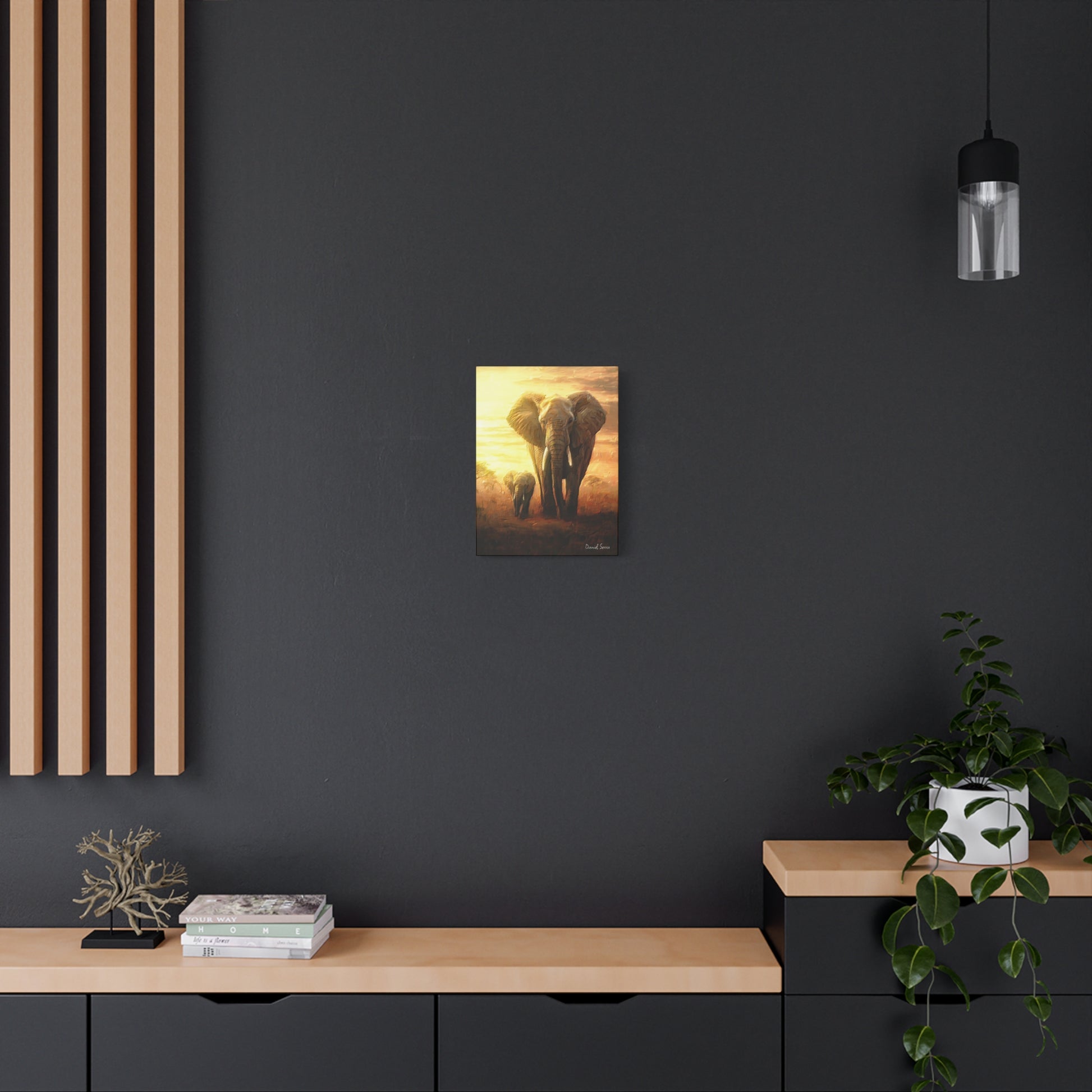 A baby elephant walks closely beside its mother, bathed in the golden light of the savannah sunset. This touching scene captures the essence of love, protection, and the unbreakable bond between mother and child.