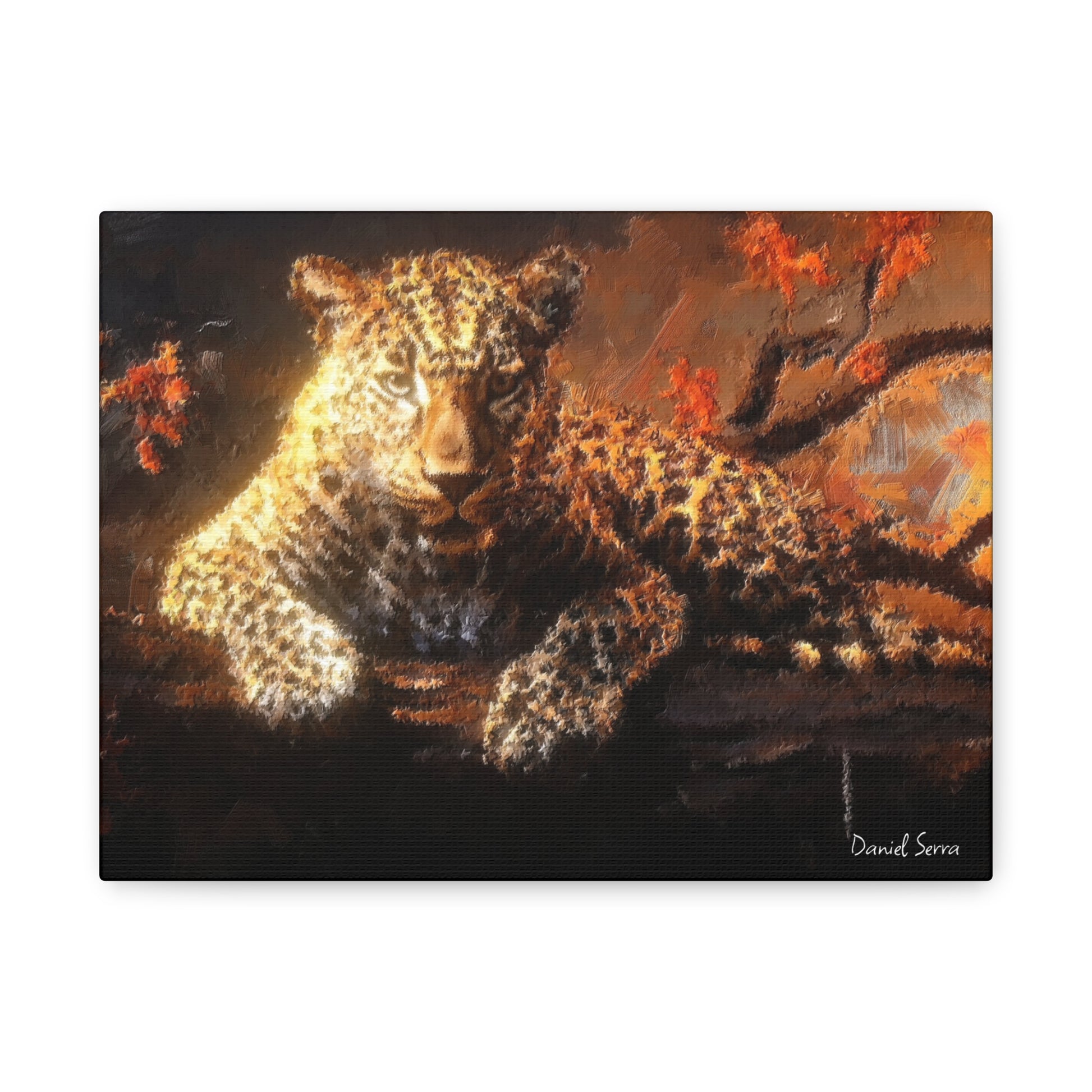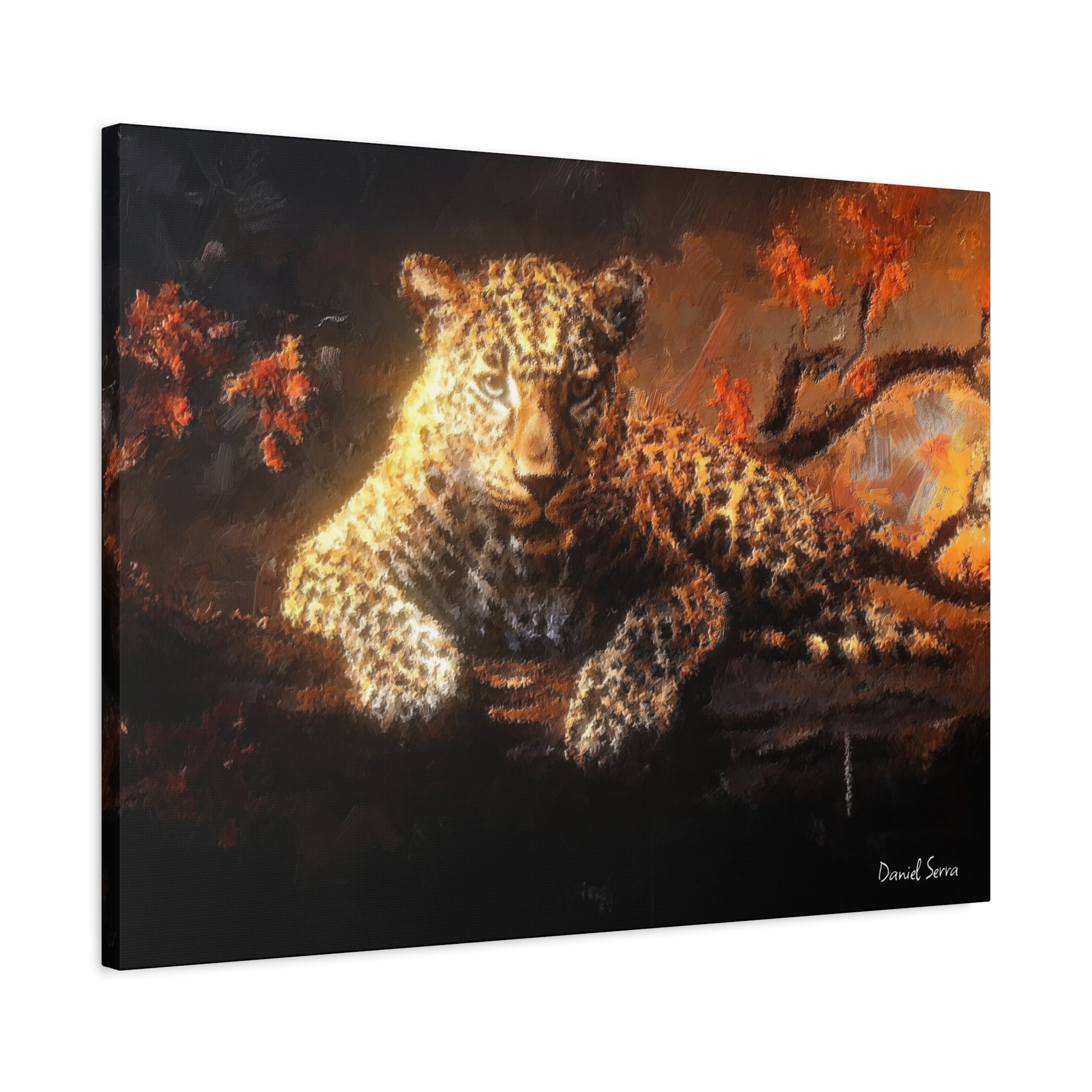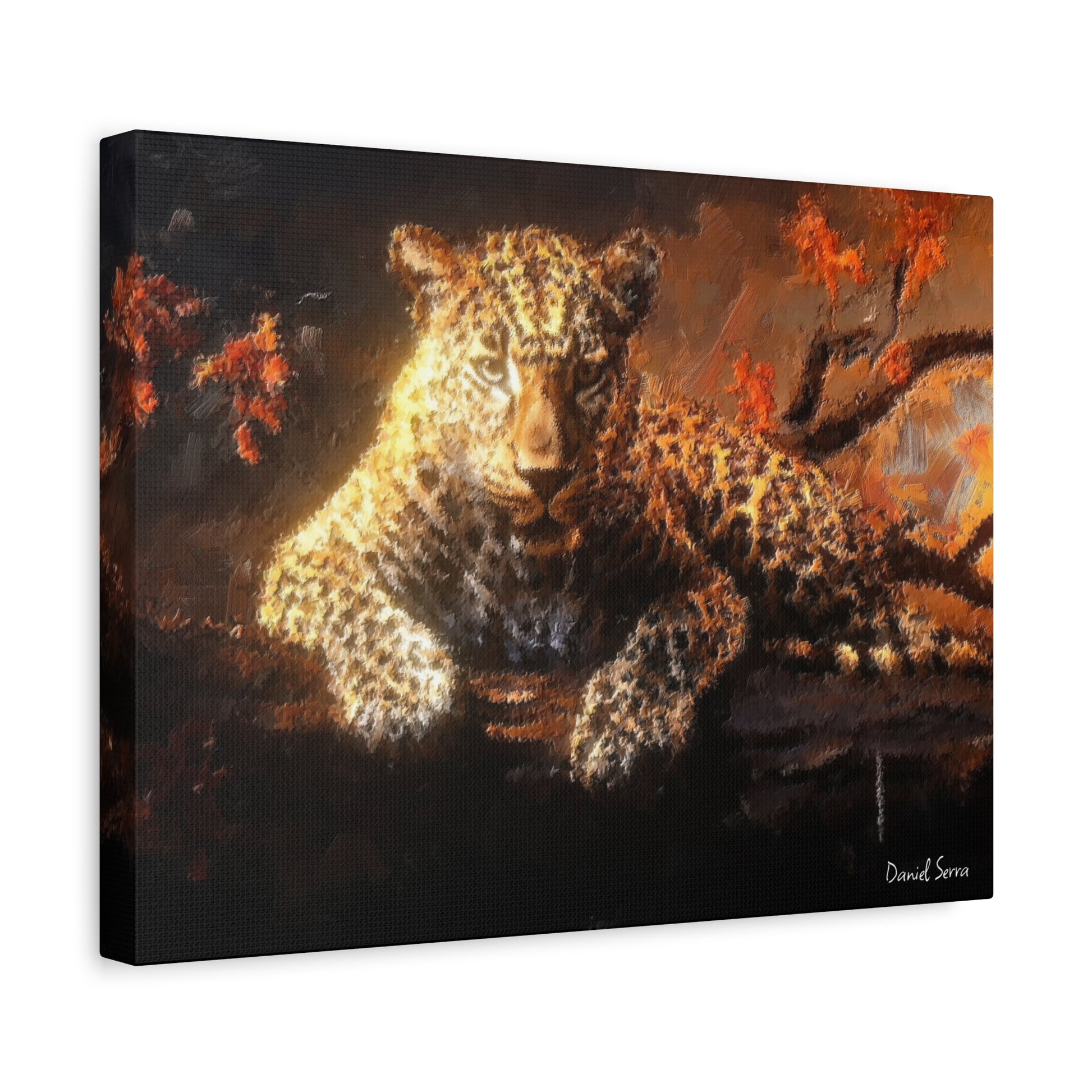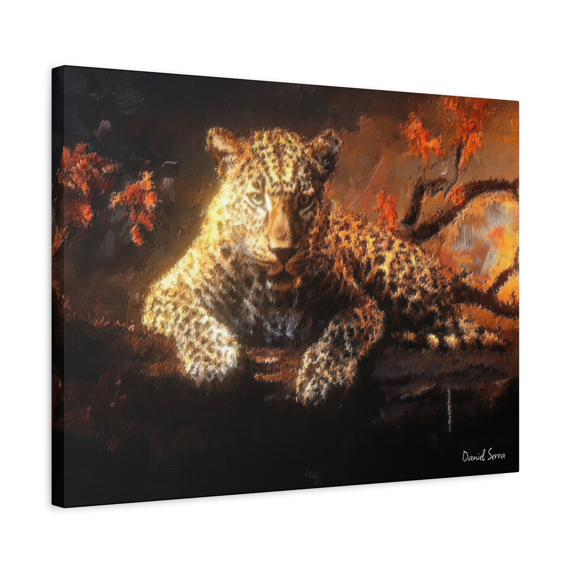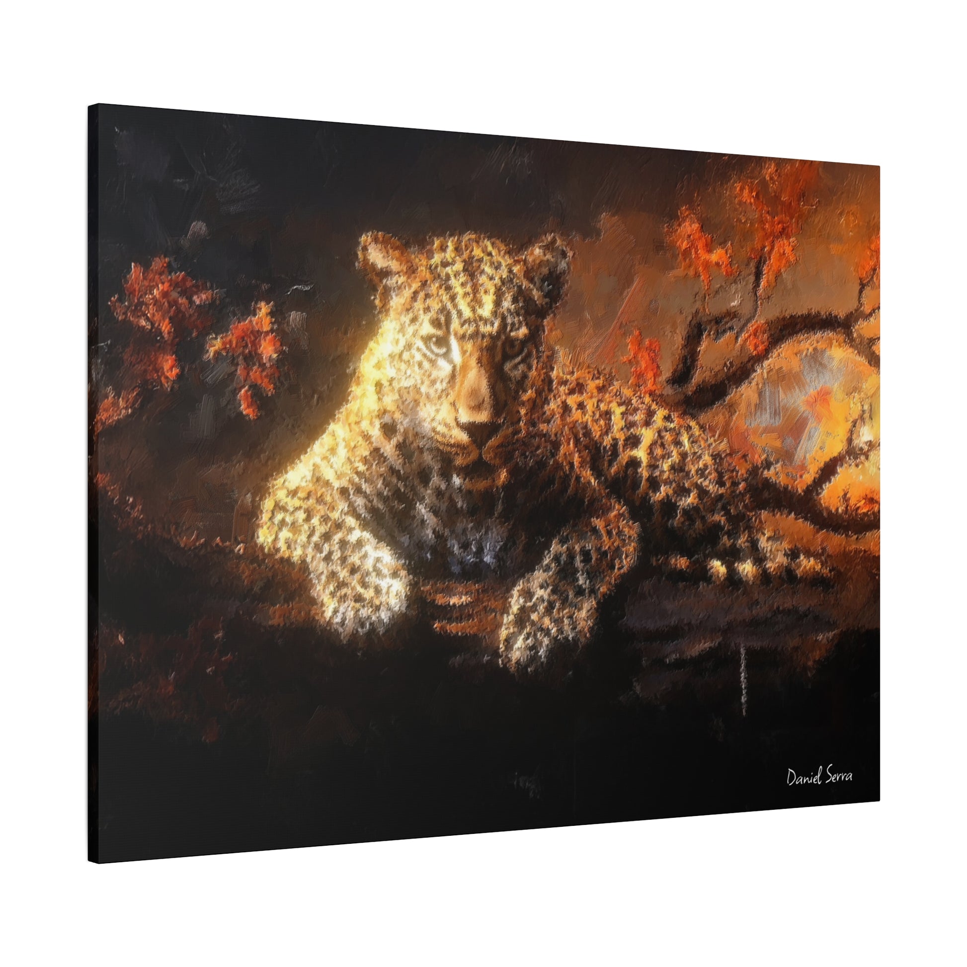 As the sun sets and the sky is painted in golden hues, a leopard rests in calm vigilance, embodying both serenity and strength. This artwork captures the timeless elegance of the wild at dusk — a guardian watching over the silence of the savannah.