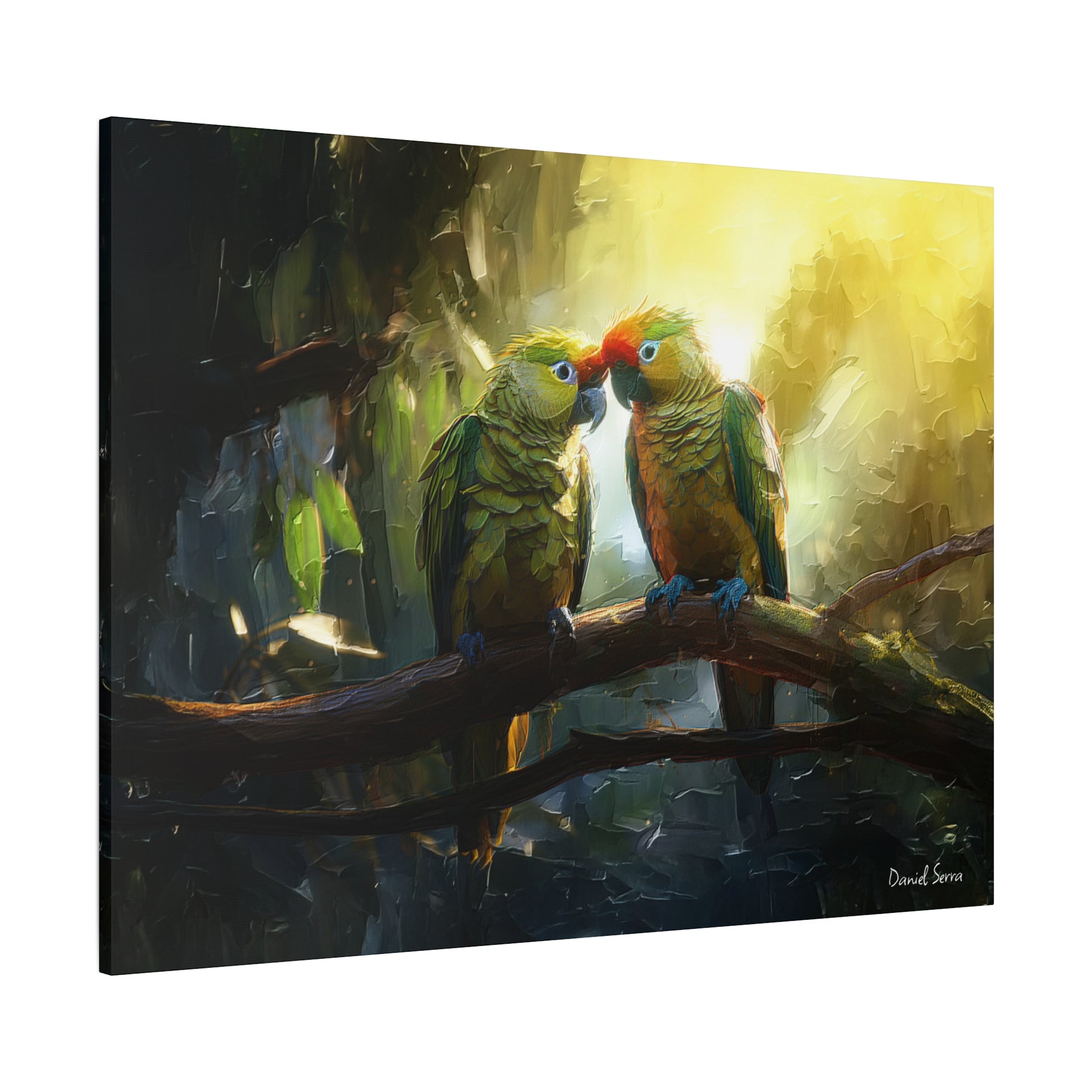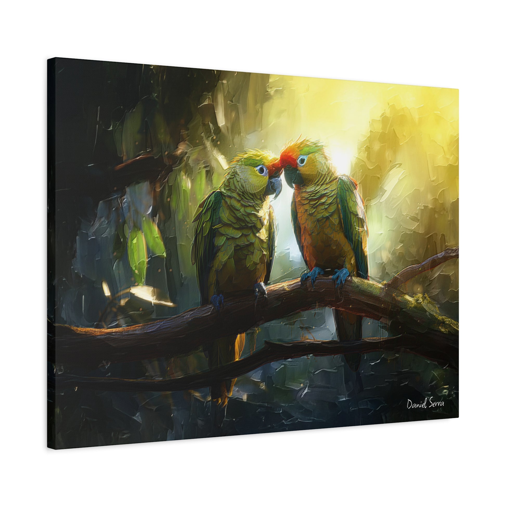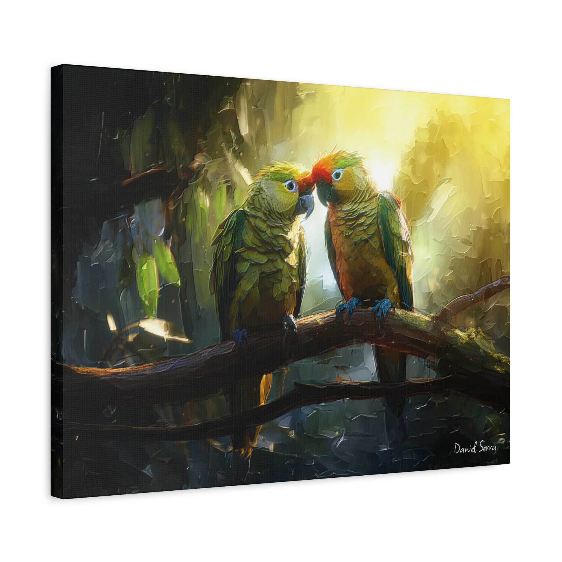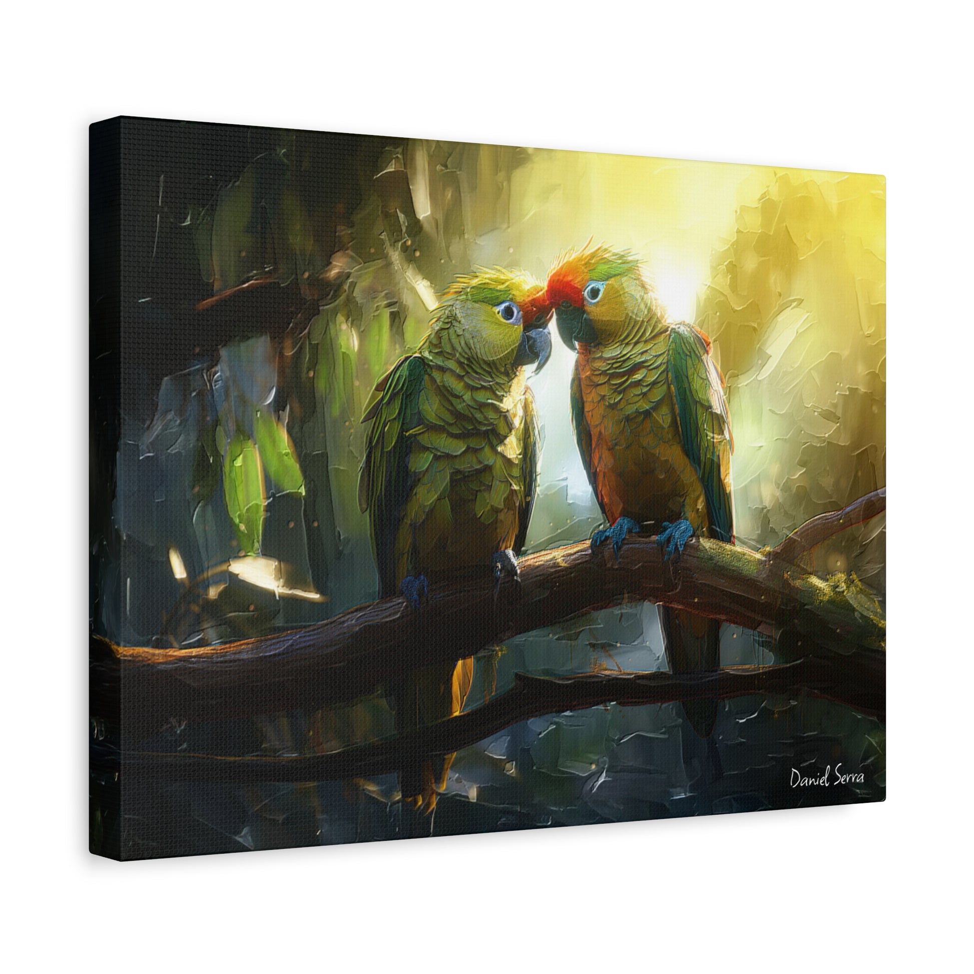 Two parrots share a tender moment beneath the golden glow of the forest light, embodying love, connection, and the vibrant spirit of the tropics. This artwork captures the harmony of nature and the beauty of companionship.