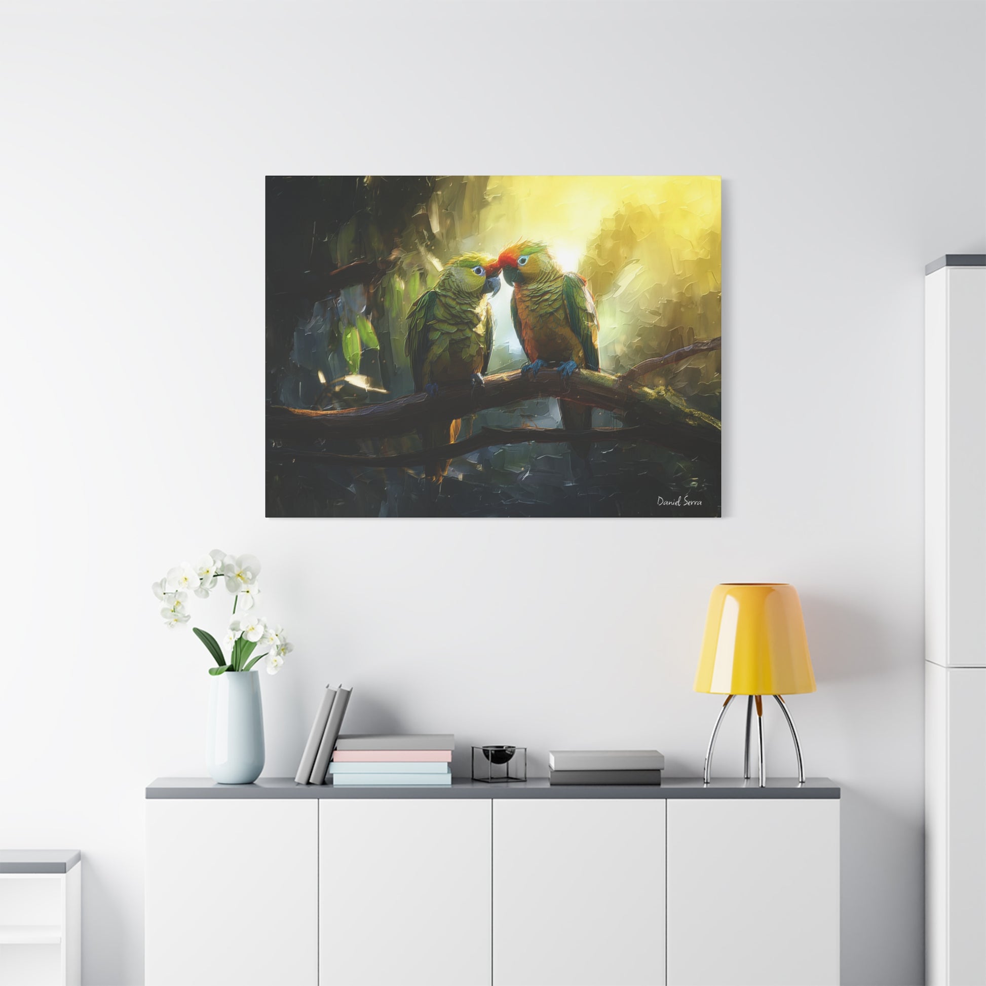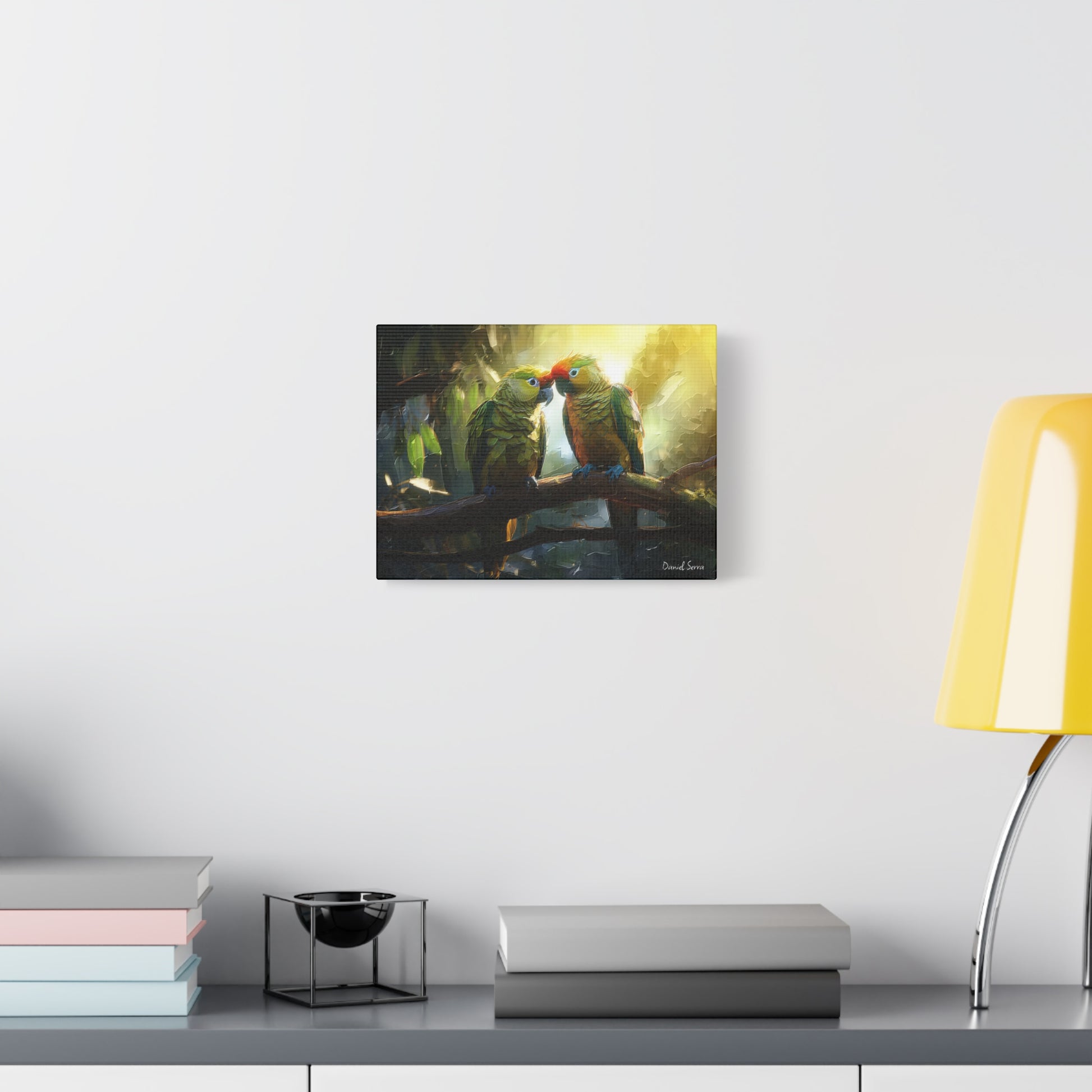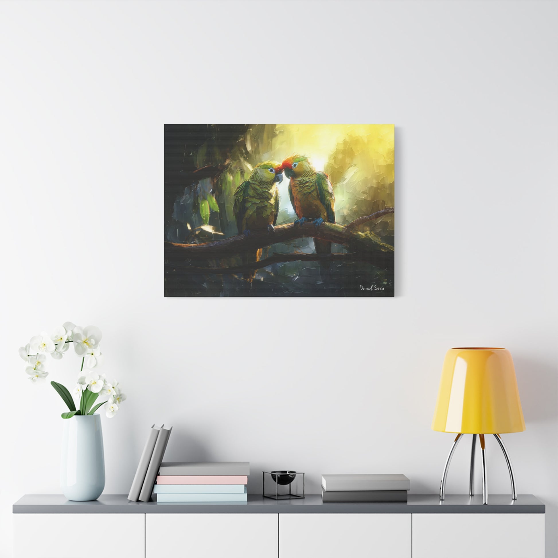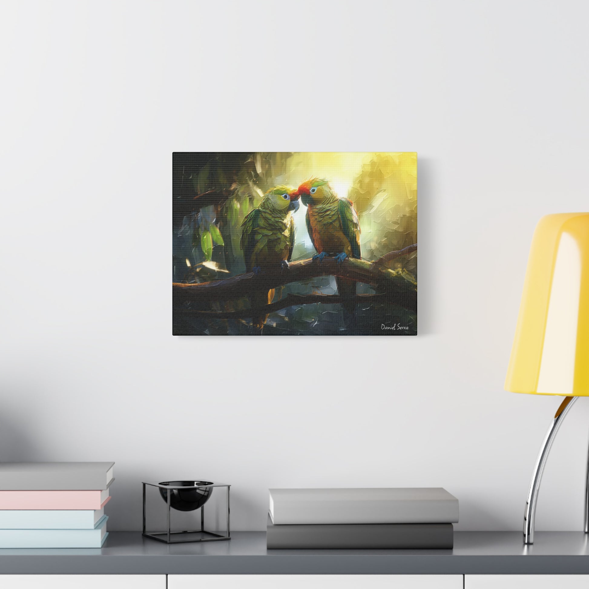 Two parrots share a tender moment beneath the golden glow of the forest light, embodying love, connection, and the vibrant spirit of the tropics. This artwork captures the harmony of nature and the beauty of companionship.