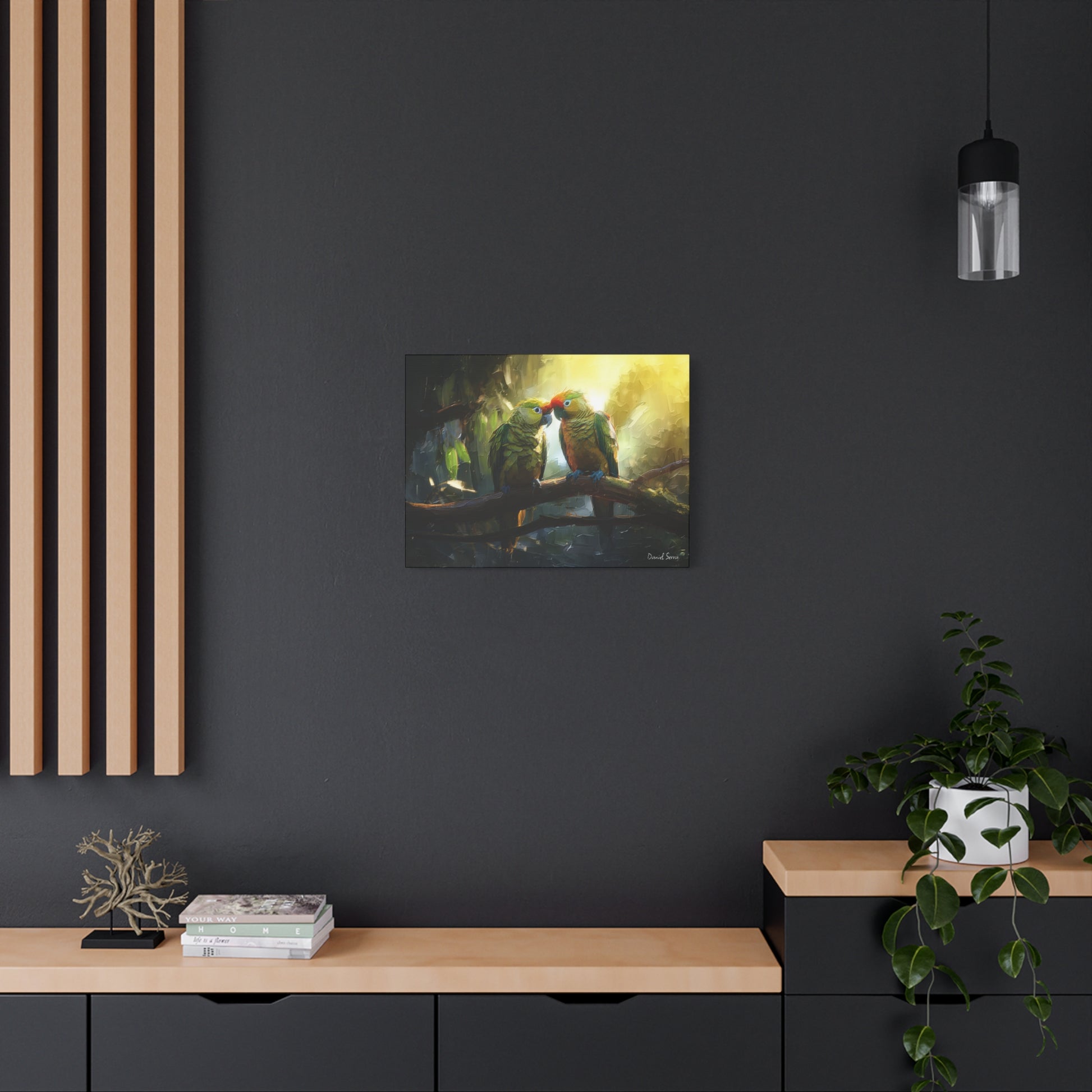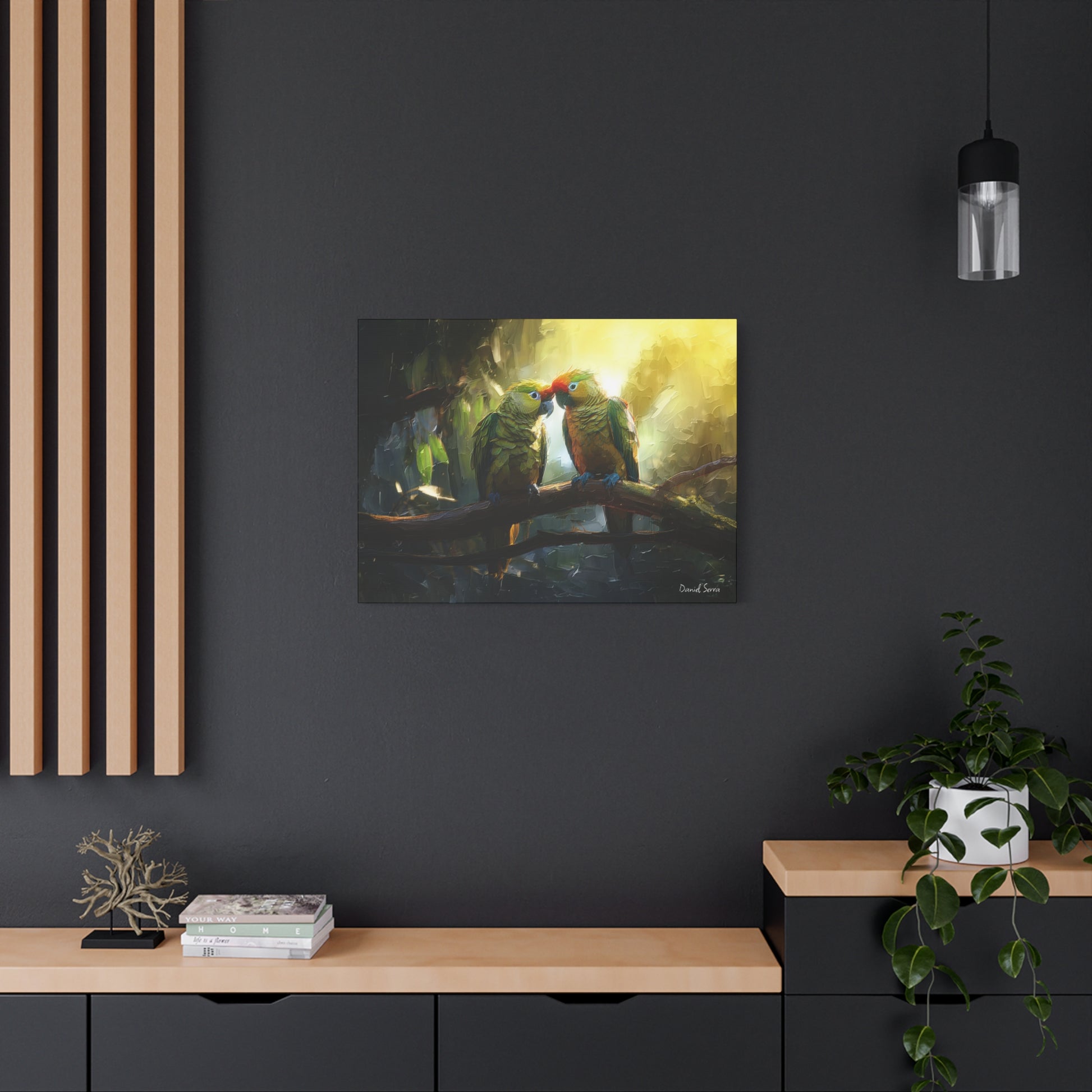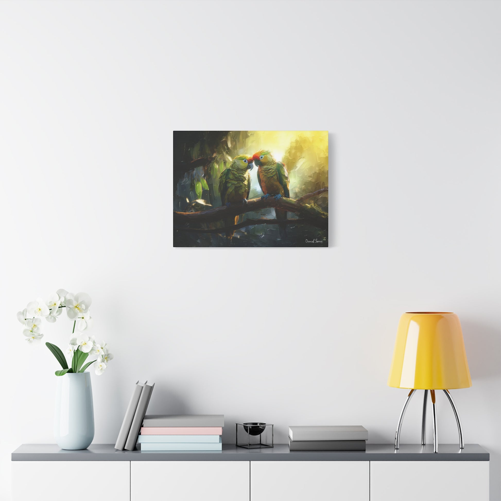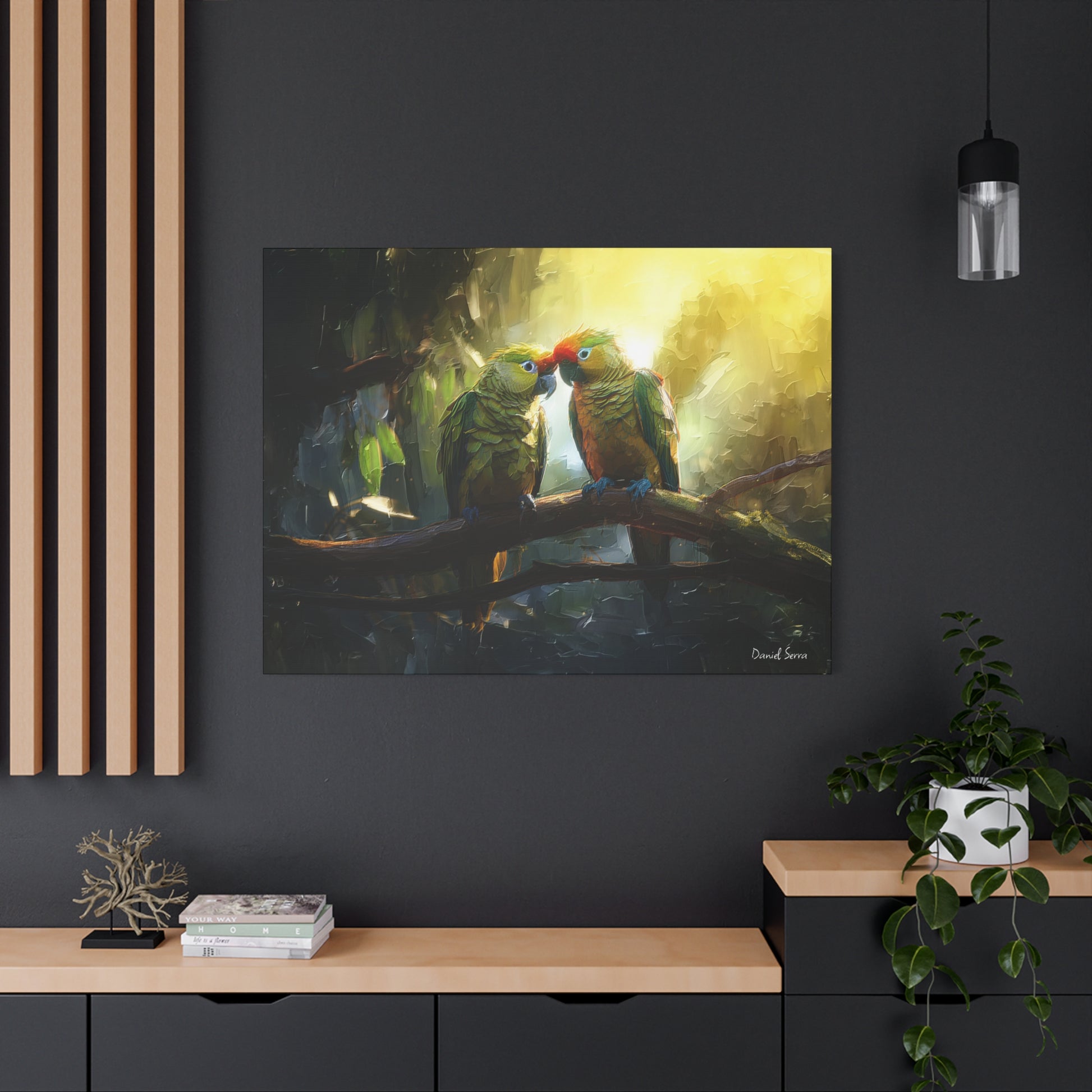 Two parrots share a tender moment beneath the golden glow of the forest light, embodying love, connection, and the vibrant spirit of the tropics. This artwork captures the harmony of nature and the beauty of companionship.